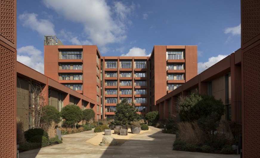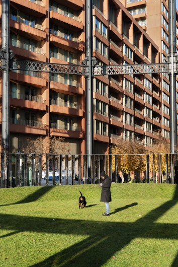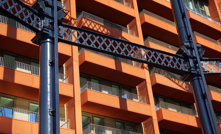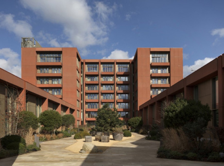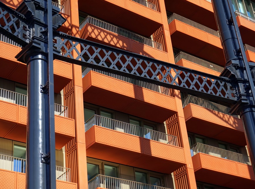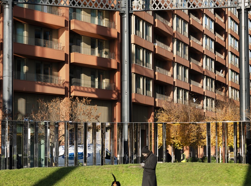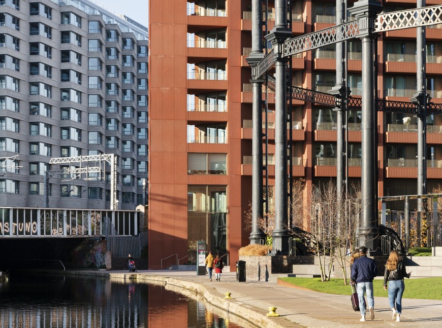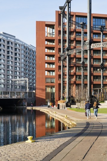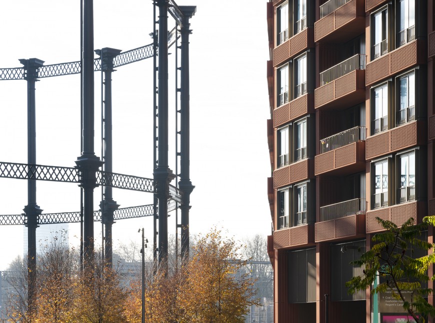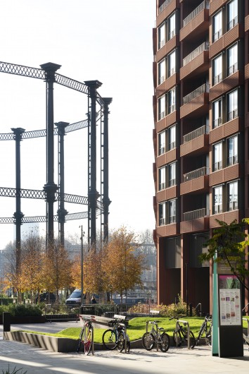 The apartments are built around a high level communal courtyard garden. The building is up to 14 storeys in height in places and sits alongside a railway, a canal and listed Gas Holders.